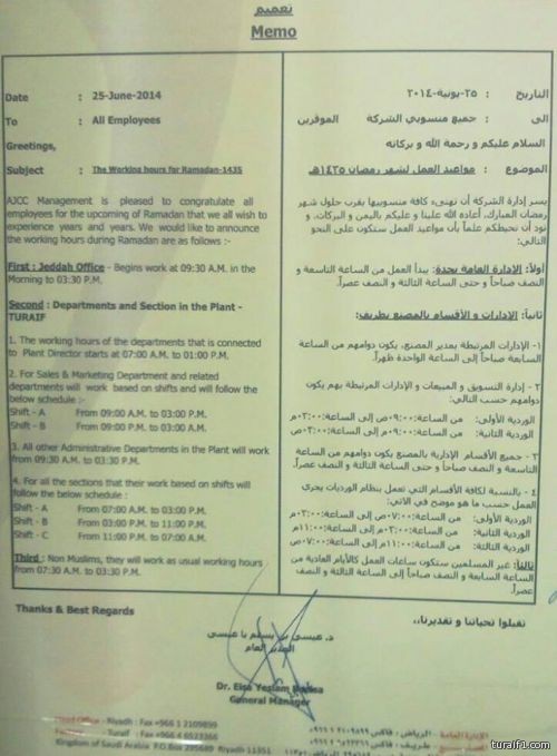 حيث أوضح عدد من العاملين أن إدارة الشركه قد أصدرت خطابا و تم توزيعه على جميع أقسام المصنع من بينها العاملين في الورديات من موظفي الأمن والحمايه والإطفاء يفيد بأن تكون ساعات العمل في رمضان 8 ساعات يوميا مساواة بالموظفين غير المسلمين و لا يتم حساب عدد الساعات الزائده أجر إضافي مما أثار حفيظه و غضب العاملين.