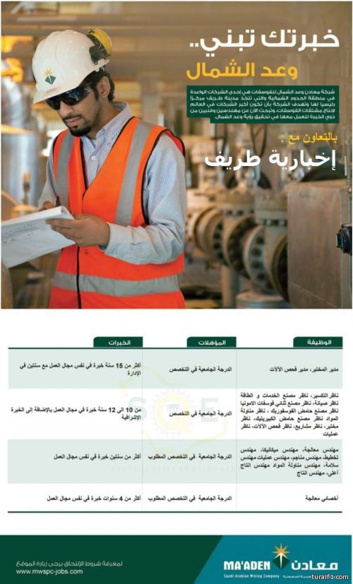 أعلنت شركة معادن وعد الشمال عبر إخبارية طريف الرسمية عن عدد من الوظائف في مشروع خادم الحرمين الشريفين لتطوير مدينة وعد الشمال للصناعات التعدينية والتي تقع شرق محافظة طريف 23 كلم .