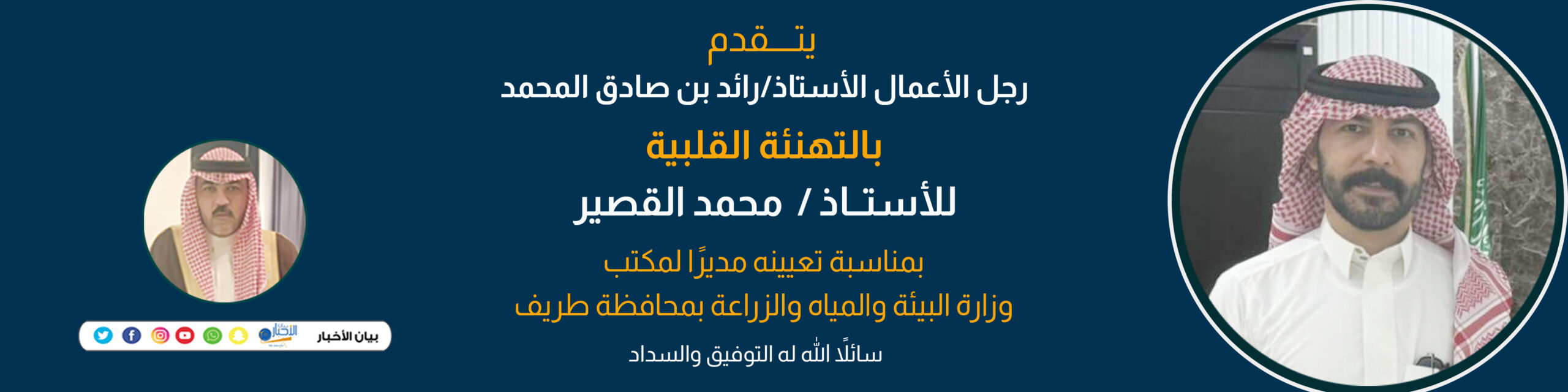 • 25/10/2025 الأستاذ عريف حسيان الرويلي يدعوكم لزواج ابنه الشاب “ساجر”.. الجمعة القادمة
