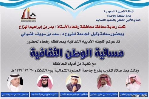 على شرف محافظ رفحاء المكلف/بدر بن ابراهيم الهزاع وبحضور وكيل جامعة الحدود الشمالية للفروع الدكتور/سعد بن سويف المضياني اقام النادي الأدبي الثقافي بالحدود الشمالية ممثلا باللجنة الثقافية للنادي برفحاء امسية شعرية بعنوان(مسائية الوطن الثقافية) وذلك بمناسبة اليوم الوطني ٨٥ على مسرح فرع جامعة الحدود الشمالية برفحاء القاها نخبة من شعراء محافظة رفحاء الشاعر/سالم بن جروان الضوي والشاعر/سعد بن عقيل المختاري والأديب/منور بن نايف الفديد والدكتور/عودة بن سويلم الشمري والشاعر/حمدان بن سالم العنزي وذلك بحضور نخبة من المهتمين بالأدب والثقافة والشعر وفي نهاية الأمسية قام محافظ رفحاء الأستاذ/بدر الهزاع. ووكيل جامعة الحدود الشمالية للفروع الدكتور/سعد بن سويف المضياني بتقديم شهادات شكر للشعراء .
