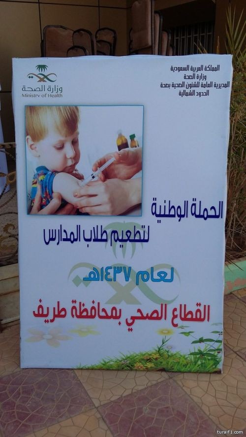 برعاية سعادة محافظ طريف أ. فارس بن نجر العتيبي وبإشراف سعادة مدير القطاع الصحي بمحافظة طريف والمشرف على مستشفى طريف العام أ. عبد الله بن ولمان العازمي وبحضور مدراء الدوائر الحكومية تم تدشين الحملة الوطنية لتطعيم طلاب وطالبات المدارس بالمحافظة لكافة المراحل وقد بلغ المجموع الكلي للطلاب ( 11696 ) طالب وطالبة .
