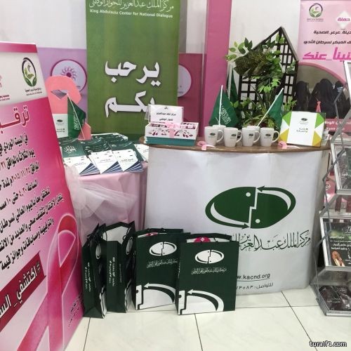 شارك مركز الملك عبدالعزيز للحوار الوطني في البرنامج الوطني للكشف المبكر عن سرطان الثدي وذلك في فعاليات البيت الوردي لجمعية زهرة في حملة التوعية بسرطان الثدي الذي أقامته الشؤون الصحية في فالي مول بركن تعريفي بالمركز وزع من خلاله عدد كبير من إصدارات المركز وتم التوضيح للزائرات البرامج التي يقدمها المركز في المنطقة والتي تهدف لنشر ثقافة الحوار من دورات تدريبية ومحاضرات وندوات وورش عمل وحلقات نقاش وكذلك أركان تعريفية .