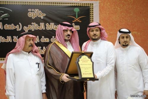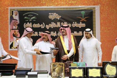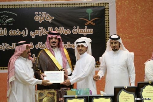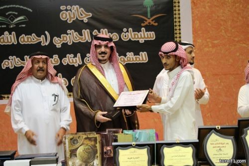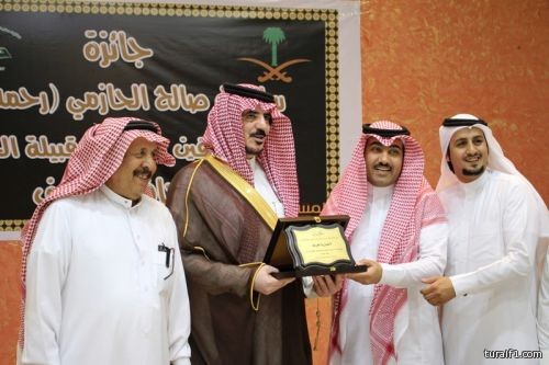أقامت قبيلة الحازم بمحافظة طريف مساء أمس الأحد الموافق ١٢ /١٠/ ١٤٣٧ هــ حفل تكريم للمتفوقين والموهوبين وخريجي الجامعات وحفظة كتاب الله من ابناء قبيلة الحازم على جائزة المغفور له بإذن الله / سليمان صالح الحازمي وذلك بحضور كبار شخصيات القبيلة من شيوخ وأعيان ورجال الأعمال وهم :