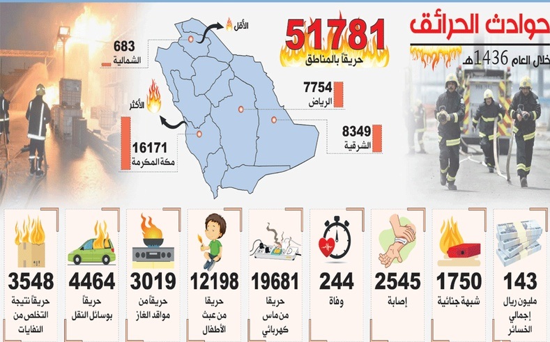 قدرت المديرية العامة للدفاع المدني في المملكة إجمالي الخسائر المالية لحوادث الحرائق خلال العام 1436هـ ما يقارب 143593827 ريالا، ونتج عن الحرائق 2545 إصابة و244 حالة وفاة (2063 ذكرا، 726 أنثى).