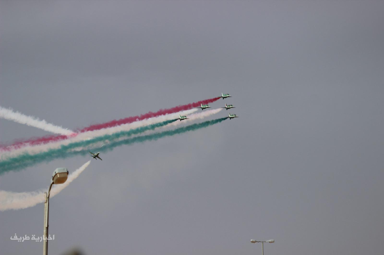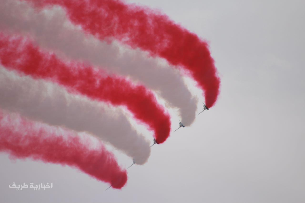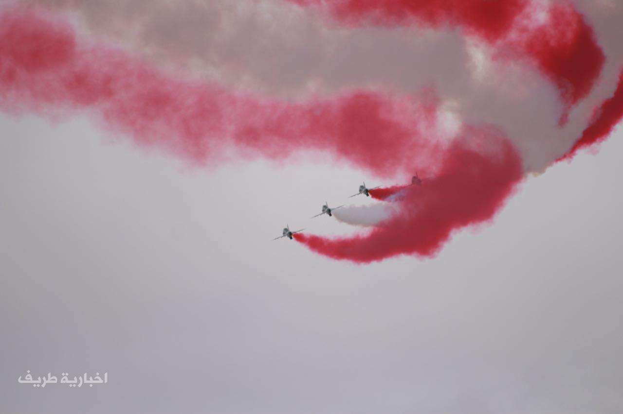ضمن فعاليات مهرجان الصقور بمحافظة طريف وبرعاية كريمة من صاحب السمو الأمير الدكتور مشعل بن عبدالله بن عبدالعزيز بن مساعد أمير منطقة الحدود الشمالية وبحضور مدير عام الهيئة العامة للسياحة والتراث الدكتور جهز الشمري زينت القوات الجوية المليكة السعودية “الصقور الخضر” سماء محافظة طريف وذلك بموقع المهرجان شرق طريف عصر اليوم الخميس بعرض اشتمل على 25 حركة مختلفة .