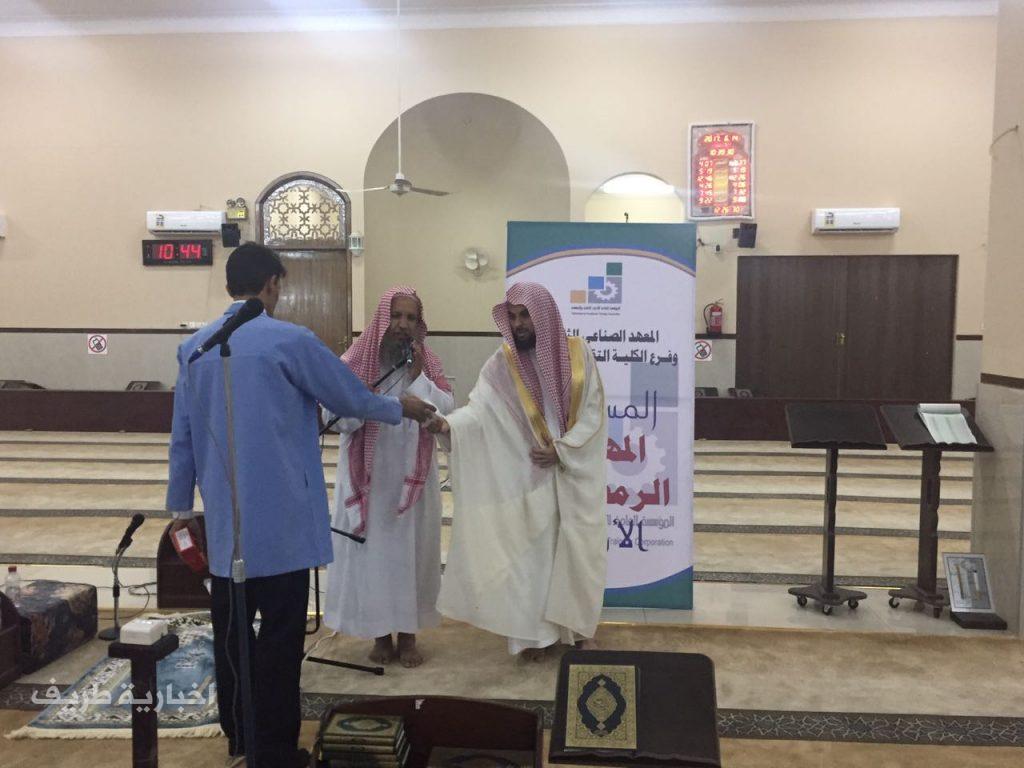 برعاية فصيلة رئيس محكمة طريف العامة الشيخ فيصل البغيل ومدير المعهد الصناعي الثانوي بطريف الأستاذ عي العبدلي اختتم المعهد الصناعي الثانوي وفرع الكلية التقنية بطريف المسابقة المهنية الرمضانية الأولى بالمعهد وذلك ضمن عدد من الأنشطة التي تسعى الإدارة إلى إقامتها من أجل نشر ثقافة المهنة في المجتعع وقد قام الشيخ فيصل البغيل بتوزيع الجوائز على الفائزين في المسابقة