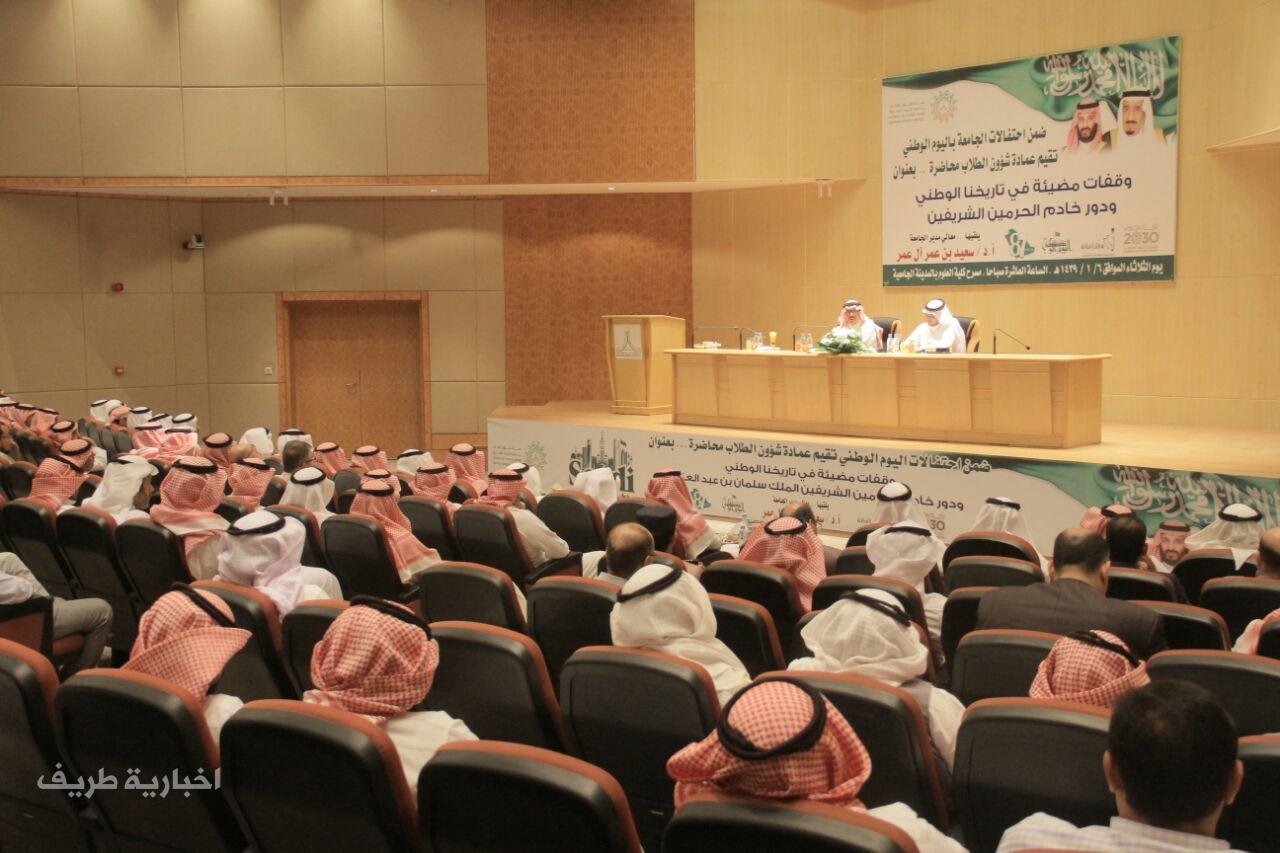 ضمن احتفالات جامعة الحدود الشمالية باليوم الوطني الـ 87 ، ألقى معالي مدير الجامعة الأستاذ الدكتور سعيد بن عمر آل عمر اليوم الثلاثاء 6/1/1439ه، في تمام الساعة العاشرة صباحاً محاضرة بعنوان” وقفات مضيئة من تاريخنا الوطني.. ودور خادم الحرمين الشريفين الملك سلمان بن عبد العزيز” وذلك على مسرح كلية العلوم بالمدينة الجامعية، بحضور أصحاب السعادة وكلاء الجامعة وعمداء الكليات، والعمادات المساندة، وأعضاء هيئة التدريس، والطلاب، وتم نقلها عبر تقنية ” الفيديو كونفرانس” إلى فروع الجامعة برفحاء وطريف والعويقيلة، بشطريها الطلاب والطالبات.