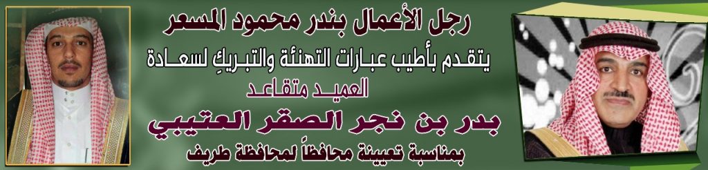 تقدم رجل الأعمال بندر محمود المسعر باسمه وباسم جميع منسوبي مؤسسة أسواق وثلاجة بندر المسعر بأسمى آيات التهاني القلبية لسعادة محافظ طريف الجديد سعادة العميد متقاعد بدر بن نجر الصقر العتيبي وذلك بمناسبة الثقة الملكية وتعيينه محافظاً لطريف بالمرتبة ال 14 سائلاً المولى عز وجل أن يمده بعونه وتوفيقه على القيام بهذه المسؤولية، في ظل توجيهات خادم الحرمين الشريفين الملك سلمان بن عبدالعزيز وولي عهده الأمين – حفظهما الله – لخدمة الوطن الغالي ، وأن يوفق لتحقيق طموحات أهالي المحافظة .