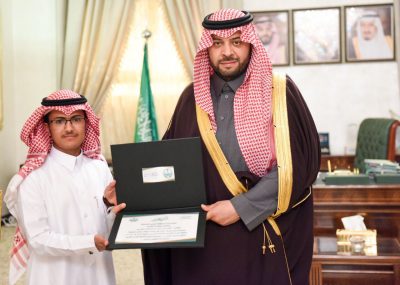 كما كرم سموه الشيخ نواف رحيل العنزي الحاصل على جائزة المركز الثاني على مستوى العالم الإسلامي في الدورة التدريبية المصاحبة لمسابقة الملك عبدالعزيز الدولية 1439هـ.