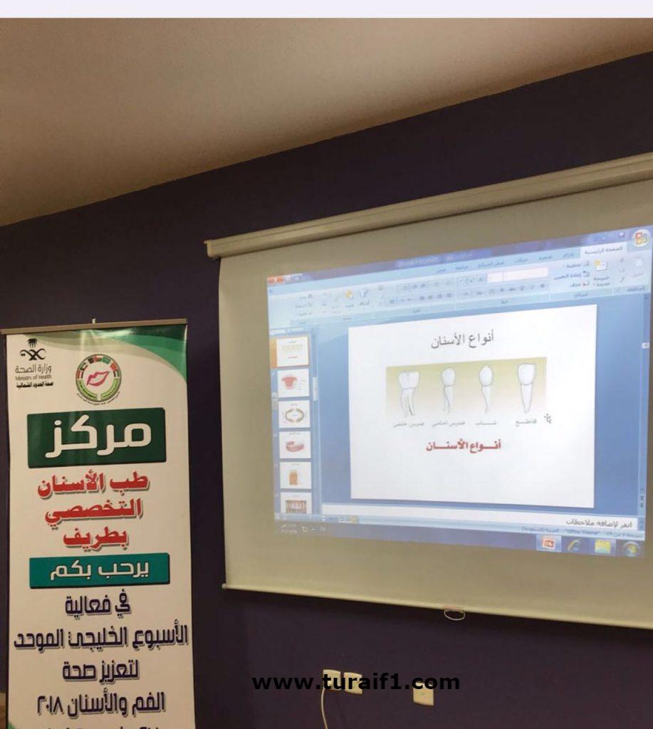 أقام مركز الأسنان التخصصي فعاليتين للاحتفاء بالأسبوع الخليجي الموحد لصحة الفم والأسنان وذلك في مدرسة أبي موسى الأشعري وكذلك في رد تاغ بمحافظة طريف حيث تم توزيع الهدايا والنشرات التوعوية وعمل الفحوصات للزوار اضافة للعدد من الفعاليات الأخرى وتوعية المواطنين والطلاب بأهمية المحافظة على الأسنان وطرق الوقاية من التسوس .