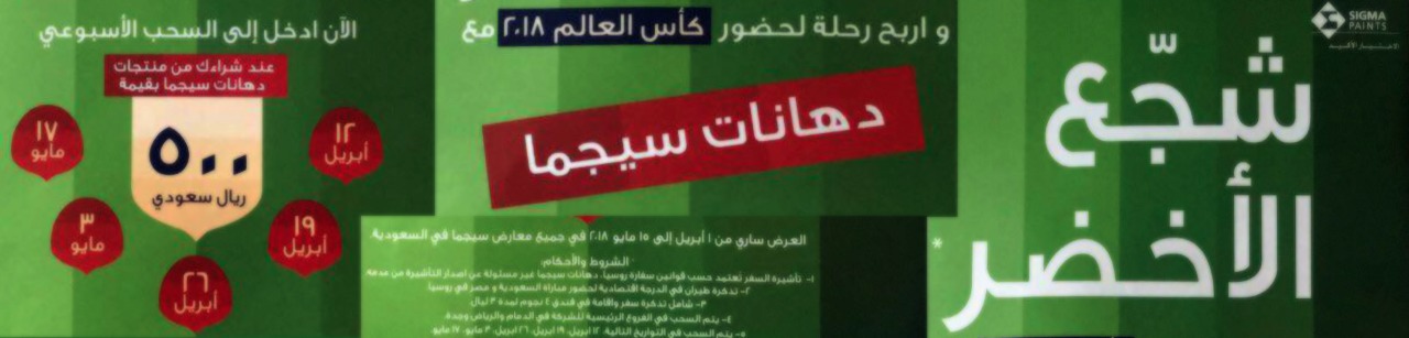 وقد أطلق المركز حملة شجع الأخضر واربح رحلة لحضور كأس العالم 2018 مع دهانات سيجما وذلك عن طريق دخول السحب الأسبوعي للفوز بهذه الرحلة بشرط شراء منتجات من دهانات سيجما بقيمة 500 ريال حيث سيتم السحب على الجوائز في أيام 12 ، 19 ، 26 أبريل وأيام 3 و17 مايو 2018 .