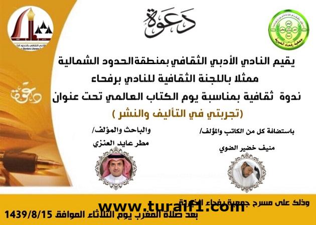 يقيم النادي الأدبي الثقافي بمنطقة الحدود الشمالية ممثلا باللجنة الثقافية للنادي برفحاء ندوة ثقافية بمناسبة يوم الكتاب العالمي تحت عنوان (تجربتي في التأليف والنشر )باستضافة كل من الكاتب والمؤلف/منيف خضير الضوي والباحث والمؤلف/مطر عايد العنزي وذلك على مسرح جمعية رفحاء الخيرية. بعد صلاة المغرب يوم الثلاثاء الموافق 1439/8/15 ويدعو المثقفين والمهتمين بالحراك الثقافي الحضور. ويدير الأمسية الأستاذ/فليح ملاك الصخيل