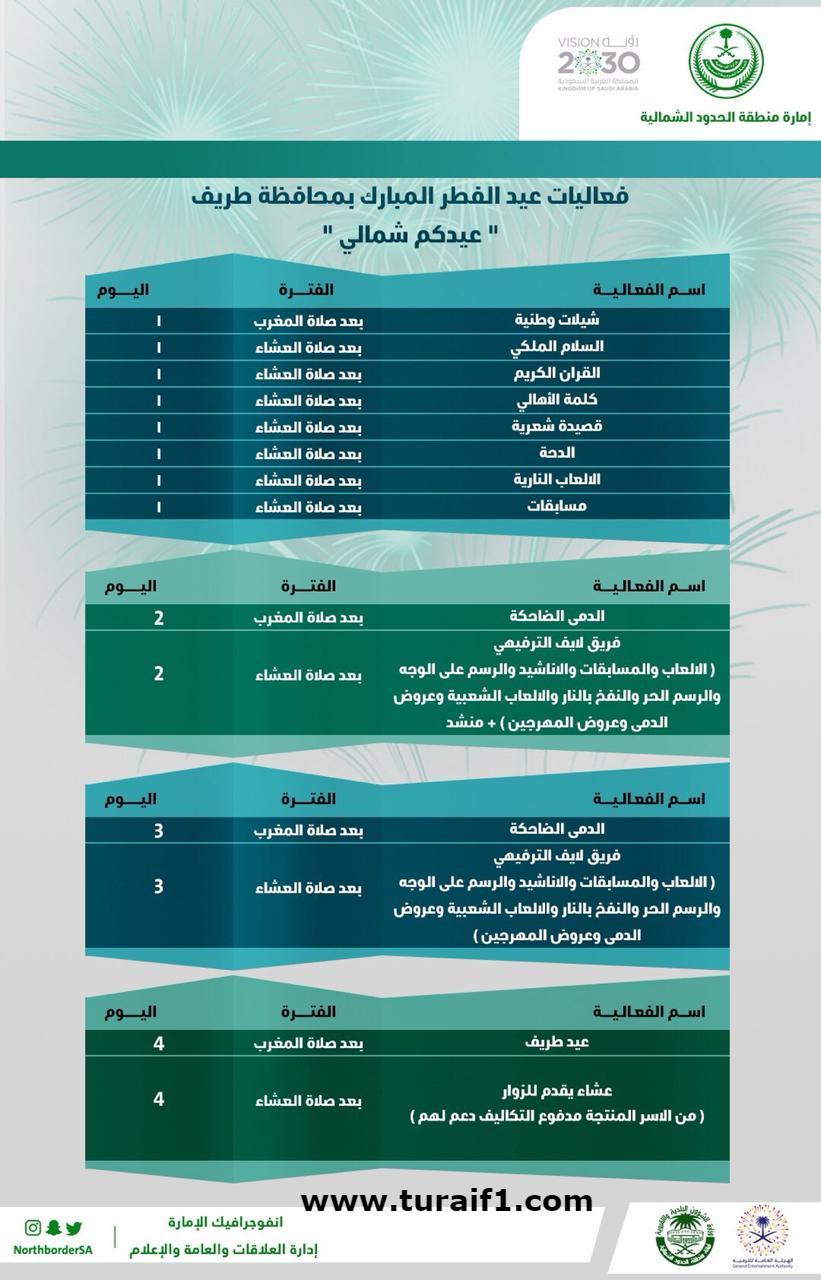 بتوجيه من صاحب السمو الملكي الأمير فيصل بن خالد بن سلطان تم اعتماد فعاليات عيدكم شمالي لعيد الفطر المبارك بمحافظة طريف اعاده الله علينا وعليكم باليمن والبركات.