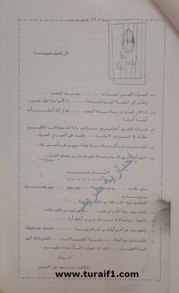 حصلت إخبارية طريف على نسخة من مجلة مدرسية تعود لأكثر من 50 عاماً لمدرسة متوسطة طريف (رائدة الشمال) وفيها مشاركات من طلاب المدرسة ونصائح لكيفية المذاكرة الصحيحة وكيف تعيش محبوباً بين أصدقائك ومقالات لتعلم جدول الضرب عند العرب وبعض قواعد اللغة الانجليزية والحقائق العلمية المفيدة .
