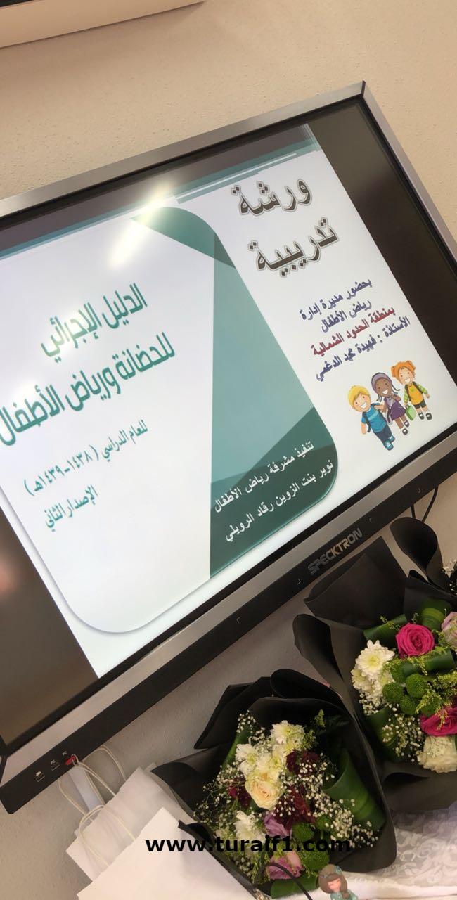 زارت مديرة إدارة رياض الأطفال بمنطقة الحدود الشمالية الأستاذة فهيدة محمد الدغمي الروضات بطريف لمتابعة سير العمل في الروضات وحضور ورشة تدريبية عن الدليل الإجرائي لرياض الأطفال من تنفيذ مشرفة رياض الأطفال الأستاذة نوير الزوين الرويلي