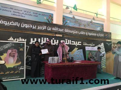 أقام قسم التوجية والإرشاد بمتوسطة عبدالله بن الزبير حفل تكريم الطلاب المتفوقين للعام الدراسي الماضي ١٤٣٨/١٣٩ اليوم الاثنين الموافق ١١/ ٣ /١٤٤٠ بحضور قائد المدرسة الأستاذ مزلوه بن جالي الرويلي ووكيلي المدرسة الأستاذ منور بن شحاذه الحازمي والأستاذ حمود فرحان الرويلي ورائد النشاط بالمدرسة الأستاذ ربيع الطرقي الرويلي و المرشد الطلابي الأستاذ محمد بن عبدالله الرويلي و قام قائد المدرسة الأستاذ مزلوه جالي الرويلي والمرشد الطلابي بتوزيع شهادات التقدير والجوائز على الطلاب المتفوقين متمنياً لهم دوام التوفيق والنجاح وفي الختام تم تكريم جميع طلاب التربية الخاصه.