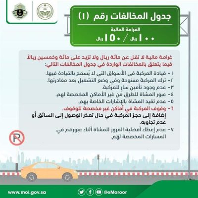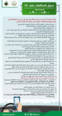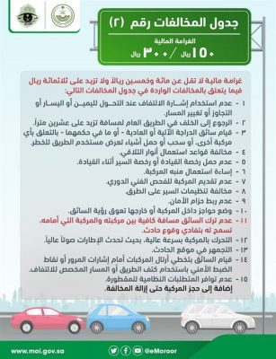 أعلنت الإدارة العامة للمرور عن بدء تطبيق الغرامات الواردة في جداول المخالفات، والتي نصت عليها المادة (٦٨) من نظام المرور، وذلك بعد الانتهاء من كافة الإجراءات الإلكترونية.