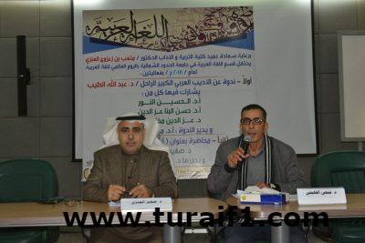 حيث افتتح الحفل بندوة عن الأديب العربي الراحل الدكتور عبدالله الطيب أدارها الدكتور محمد حدوش وتحدث فيها الأستاذ الدكتور الحسين النوار، تناول فيها جوانب مهمة من السيرة العلمية للدكتور الطيب بالإضافة إلى شخصيته وأثره الواضح في الأدب العربي.