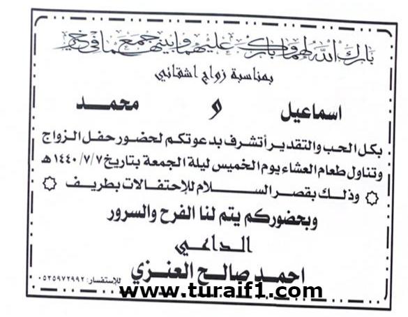 بكل الحب والتقدير يتشرف الأستاذ / أحمد صالح العنزي بدعوتكم لتناول العشاء وحضور حفل زفاف أشقائه الأستاذ اسماعيل والأستاذ محمد وذلك يوم الخميس الموافق ١٤٤٠/٧/٧ هـ بقصر السلام للإحتفالات بطريف .
