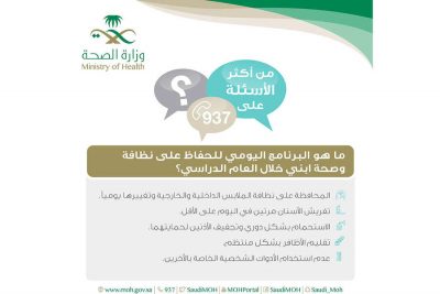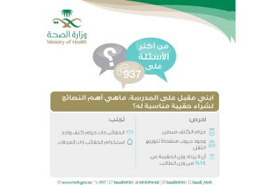 وعبر صفحتها الرسمية، قالت الوزارة، ردًّا على التساؤلات المتعلقة بعودة الأطفال إلى المدارس: «احرصي على أخــذ ابنــك ســاعات كافيــة مــن النــوم للاســتيقاظ مبكــرًا، فقِلَّتها تؤثر في النشاط البدني والتحصيل الدراسي خلال العام»، مؤكدةً أهمية تناول الطفل وجبـة الإفطـار فـي المنـزل؛ للتأكـد مـن تناولهـا، وأن تحتوي على البروتينات، والخضار، والنشويات، والفواكه.