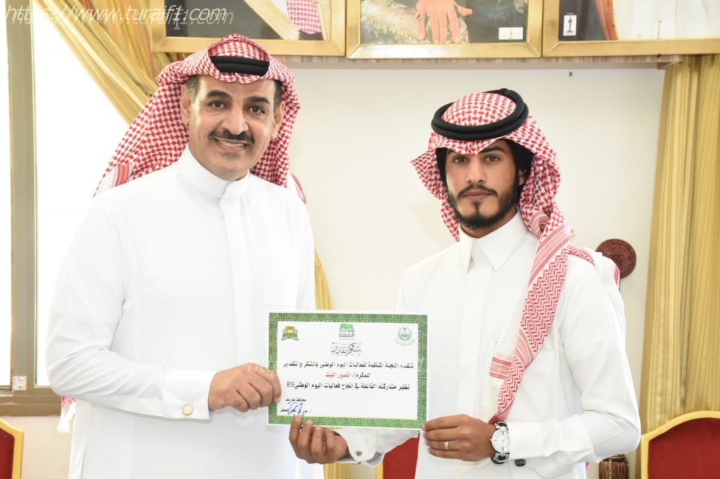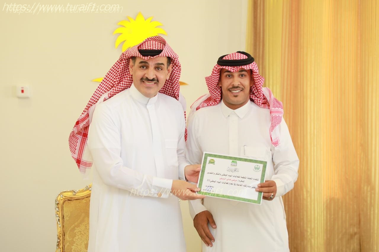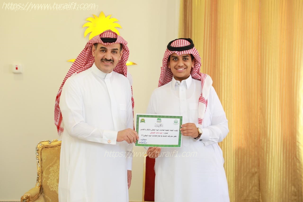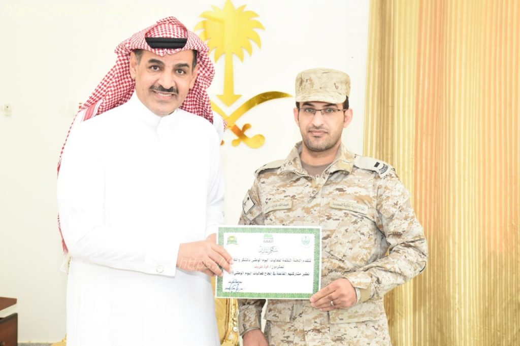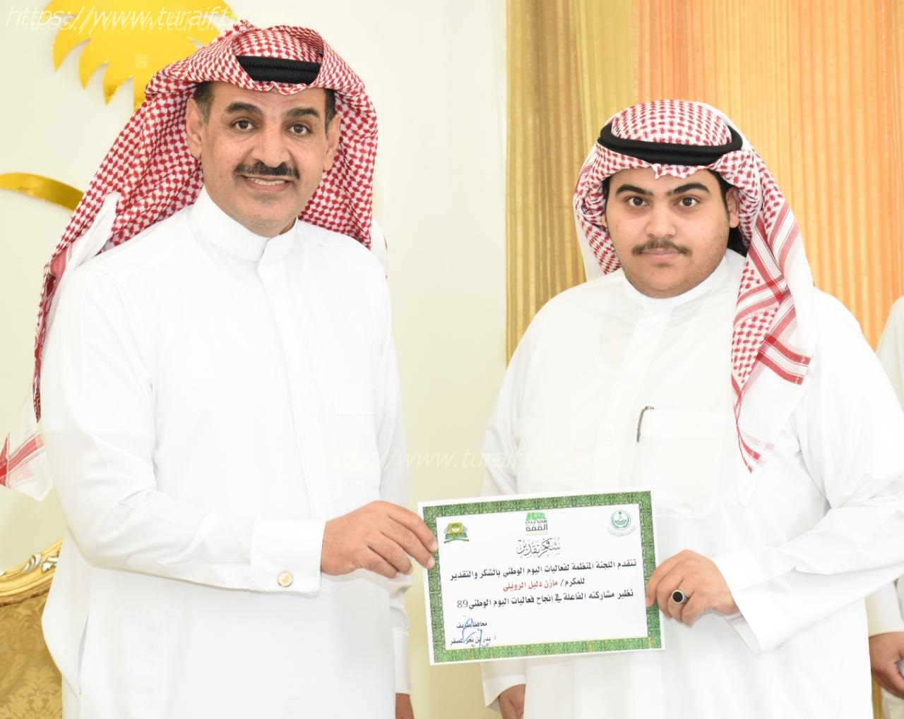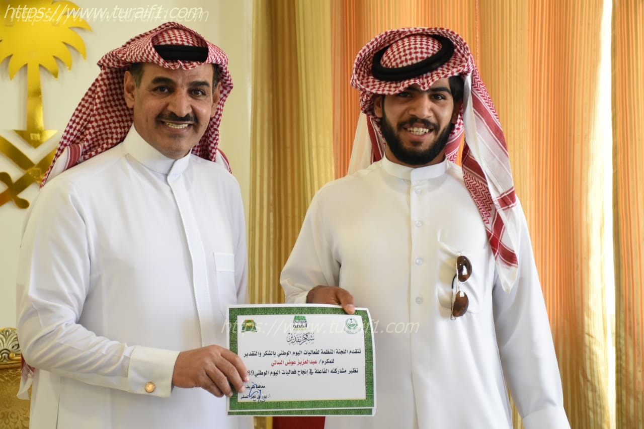 كرم سعادة محافظ طريف الاستاذ بدر بن نجر الصقر اليوم الإثنين الموافق ١ / ٢ / ١٤٤١ هـ الجهات المشاركة في فعاليات اليوم الوطني الـ ٨٩ للمملكة العربية السعودية من الشرطة والمرور والدفاع المدني وأمن الطرق والدوريات الأمنية والهلال الأحمر وقوة طريف والمباحث و الاستخبارات وحرس الحدود وبلدية محافظة طريف وشركة أسمنت الجوف .
