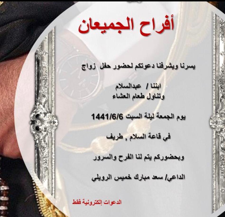 بكل الحب والتقدير يتشرف سعد مبارك خميس الرويلي بدعوتكم لتناول طعام العشاء وحضور حفل زواج ابنه الشاب “عبدالسلام” وذلك يوم الجمعة ليلة السبت الموافق 6 /6/ 1441 هـ بقاعة السلام للاحتفالات بطريف .