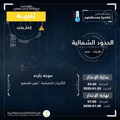 وأصدرت الهيئة العامة للأرصاد وحماية البيئة تنبيهًا، يشير إلى تأثُّر منطقة الحدود الشمالية “طريف وعرعر” بموجة باردة، وتكوُّن الصقيع، بدءًا من الساعة الحادية عشرة والنصف من مساء اليوم السبت حتى الساعة السابعة من صباح غد الأحد.