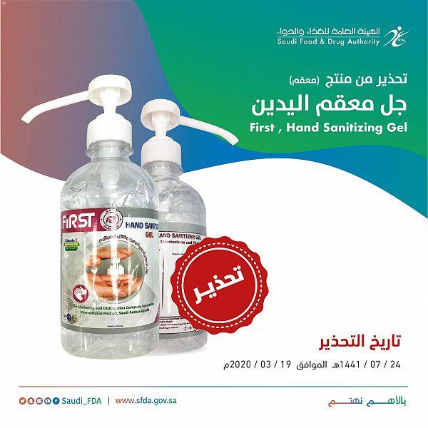 حذّرت الهيئة العامة للغذاء والدواء من منتج جل معقم لليدين يحمل اسم “First, Hand Sanitizing Gel” من إنتاج مصنع راية البيان للمعقمات والمطهرات الطبية ومستحضرات التجميل، بسبب احتوائه على نسبة عالية من الكحول الميثيلي (ميثانول).