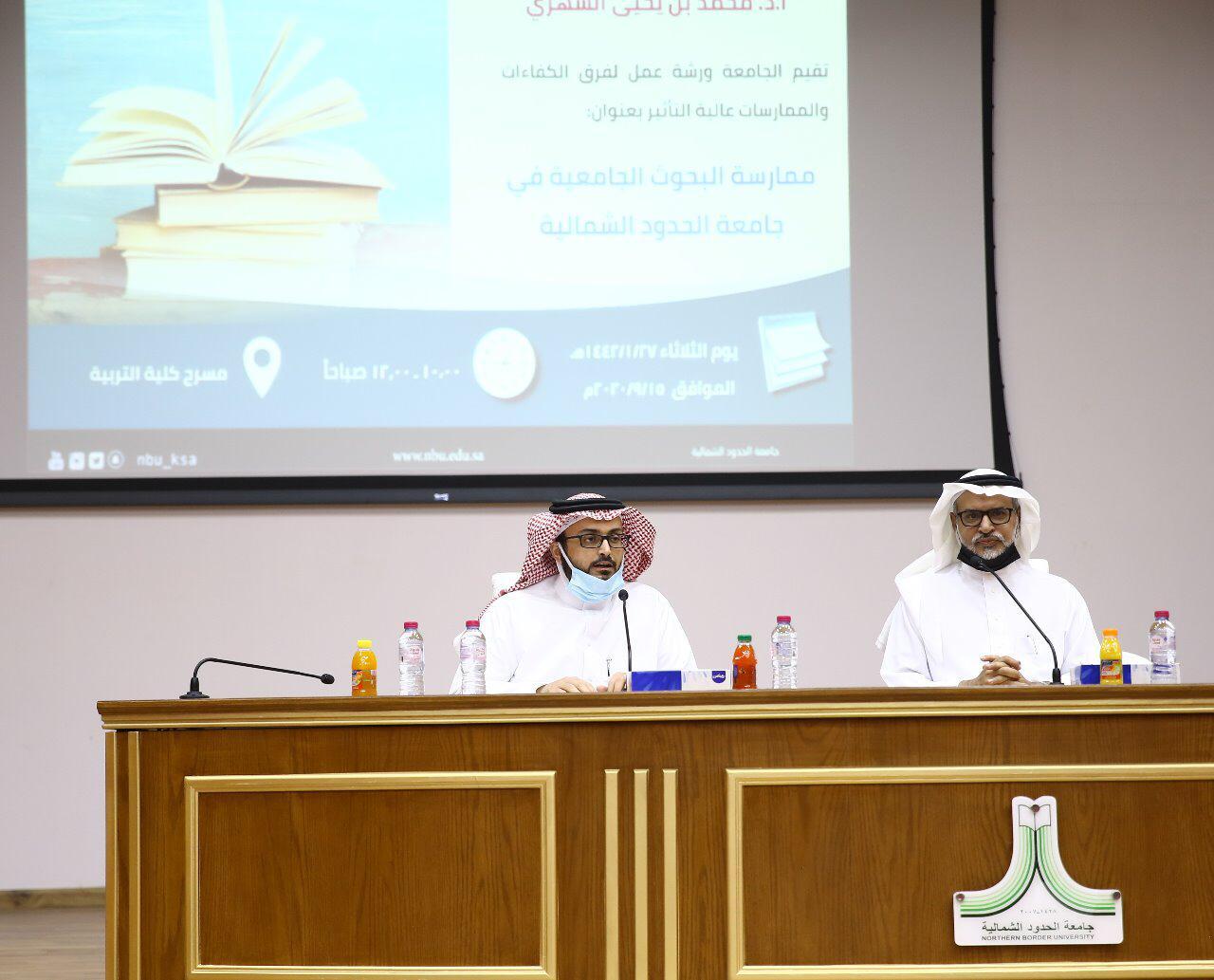 تحت رعاية معالي رئيس جامعة الحدود الشمالية الأستاذ الدكتور محمد بن يحيى الشهري، نظمت الجامعة ورشة عمل بعنوان ممارسة البحوث العلمية عالية التأثير، التي قدمها سعادة مساعد وكيل الجامعة للشؤون الأكاديمية-رئيس اللجنة التنفيذية الدائمة للممارسات التعليمية عالية التأثير الدكتور مهند المطيري، وفريق ممارسة البحوث الجامعية، وذلك في تمام الساعة العاشرة من صباح يوم الثلاثاء ٢٧/ ١ / ١٤٤٢ه الموافق ١٥/ ٩ / ٢٠٢٠م على مسرح كلية التربية والآداب في مقر الجامعة بمدينة عرعر، حيث حضرها أصحاب السعادة وكلاء الجامعة، ومساعدوهم، وعدد من عمداء وعميدات الكليات والعمادات المساندة، ورؤساء وأعضاء فرق الممارسات عالية التأثير.