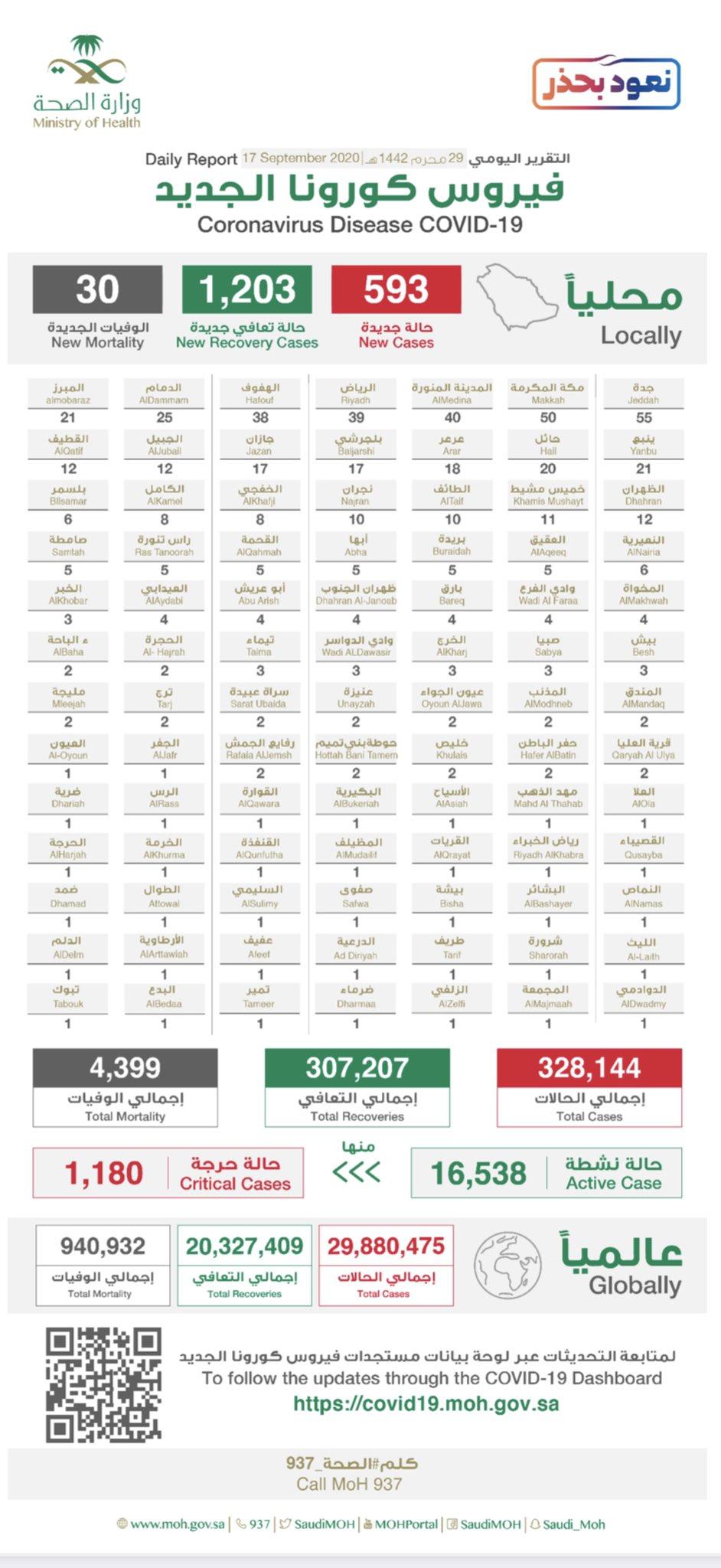 أعلنت وزارة الصحة، اليوم (الخميس) تسجيل 593 حالة إصابة جديدة مؤكدة بفيروس كورونا المستجد (كوفيد 19)، خلال الـ24 ساعة الماضية، ليرتفع إجمالي الحالات في المملكة إلى 328144 حالة.