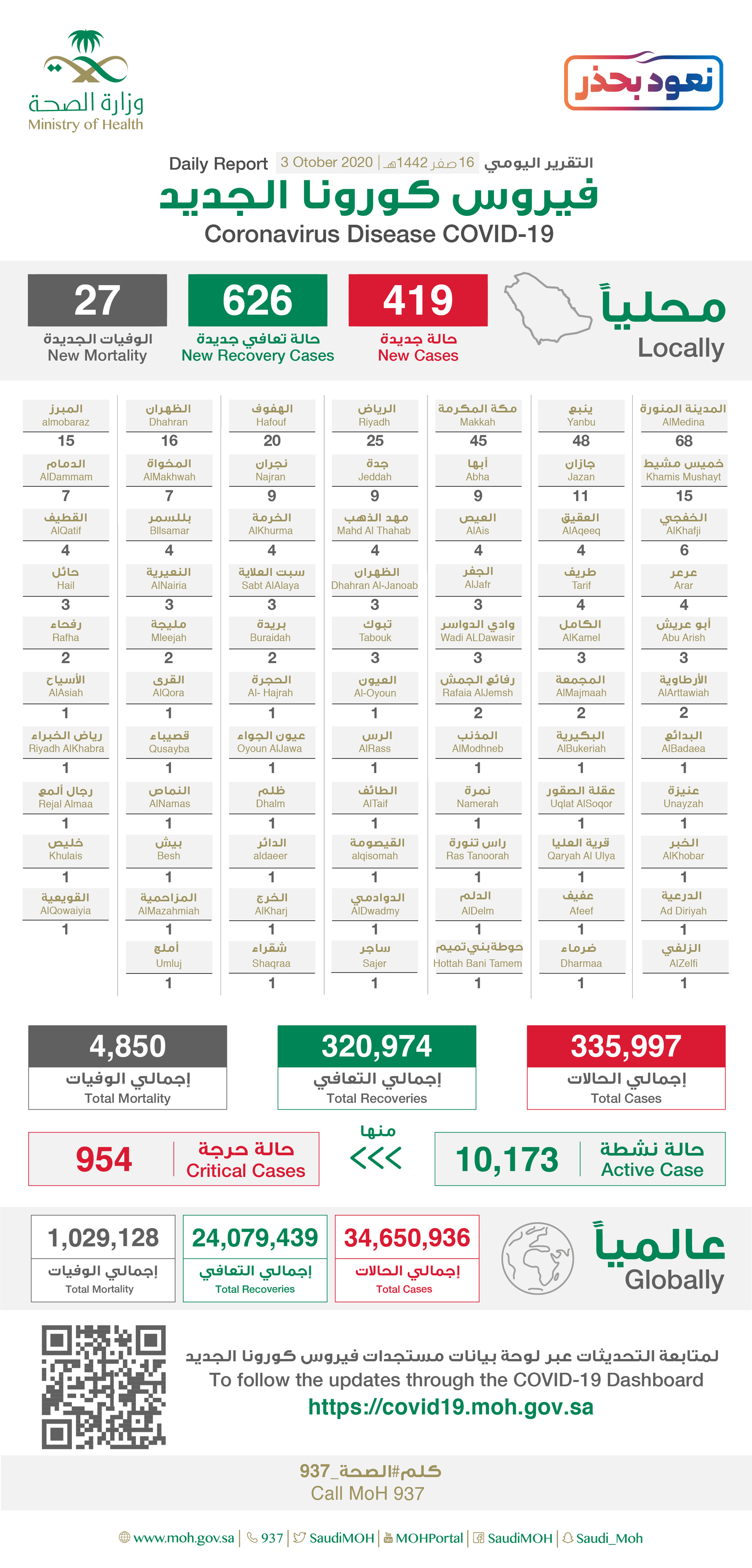 وقالت الوزارة أنه تم تسجيل 626 حالة تعاف جديدة ليصبح الإجمالي 320974 حالة ولله الحمد.