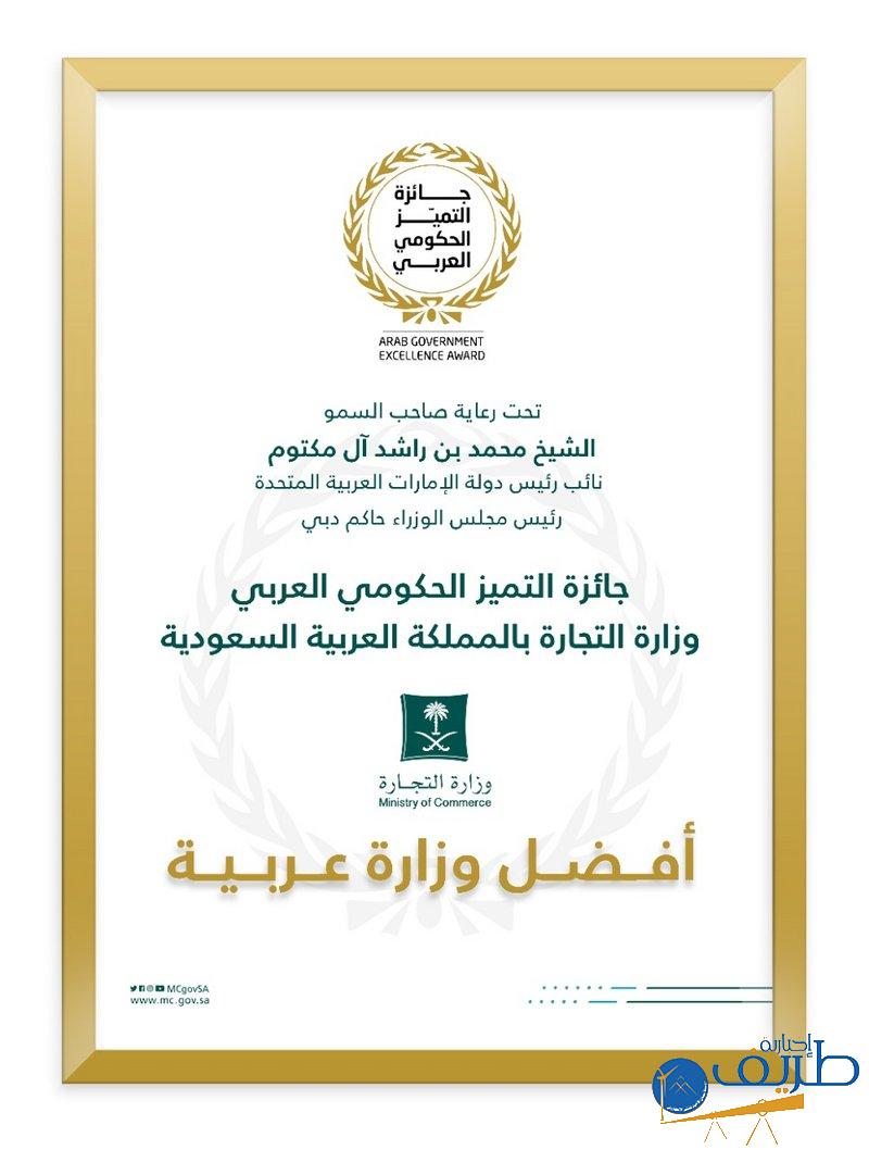 وتُوجت وزارة التجارة، اليوم، بجائزة التميُّز الحكومي العربي؛ كأفضل وزارة عربية من بين أكثر من 5000 مشاركة حكومية عربية، نتيجة للتميُّز المؤسّسي وفق أفضل المعايير الدولية، وتبني مفاهيم الابتكار والتطوير، وحوكمة الأداء لتحقيق الأهداف والإستراتيجيات المرتبطة بالرؤية.
