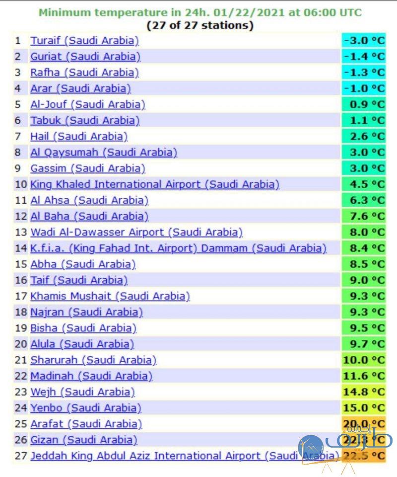 أعلن المركز الوطني للأرصاد أن مدينة طريف سجلت أدنى درجة حرارة (3-) فجر اليوم، فيما سجلت جده درجة الحرارة الأعلى بـ22.5 الصغرى، والعظمى 32.