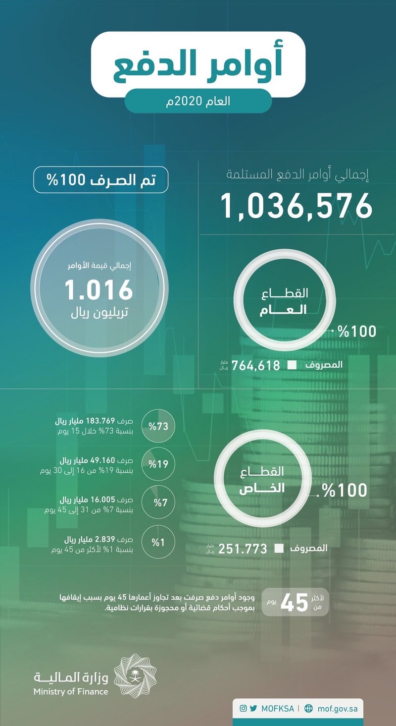 أعلنت وزارة المالية، إنهاء إجراءات صرف جميع أوامر الدفع المستلمة من القطاعين العام والخاص خلال العام 2020م؛ وذلك بقيمة إجمالية بلغت 1.016.39 تريليون ريال وبنسبة صرف 100%.