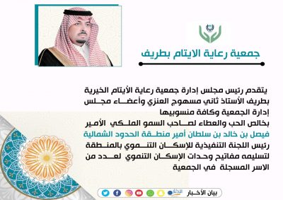 ونحن في مجلس إدارة جمعية رعاية الأيتام بطريف وكافة منسوبي الجمعية نتقدم بالشكر الجزيل لصاحب السمو الملكي الأميرفيصل بن خالد بن سلطان أمير منطقة الحدود الشمالية