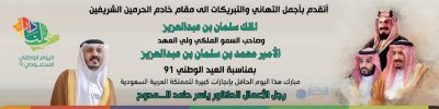 رفع رجل الأعمال الدكتور ياسر بن حامد المدوح التهنئة لمقام خادم الحرمين الشريفين الملك سلمان بن عبدالعزيز آل سعود، وإلى صاحب السمو الملكي الأمير محمد بن سلمان بن عبدالعزيز ولي العهد نائب رئيس مجلس الوزراء وزير الدفاع وللشعب السعودي الوفي بمناسبة ذكرى اليوم الوطني الـ91 .