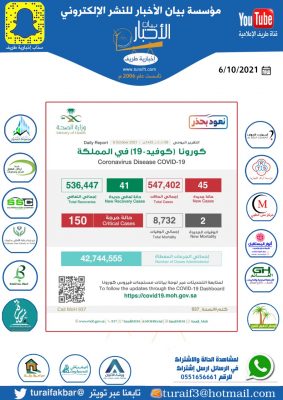 وقالت الوزارة إنه تم تسجيل 41 حالة تعافٍ جديدة ليصبح الإجمالي 536447 حالة ولله الحمد.