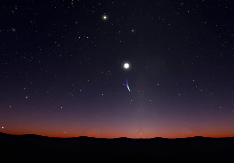 وأضاف: إذا كنا محظوظين قد نرى ذيلًا ساطعًا، حيث ينعكس ضوء الشمس عن مسار الغبار الممتد بعيدًا عن الشمس باتجاهنا مثل طائرة نفاثة عند غروب الشمس، ويمكن للمذنب أن يقدم عرضًا جيدًا حتى لو بدأ في التفكك.