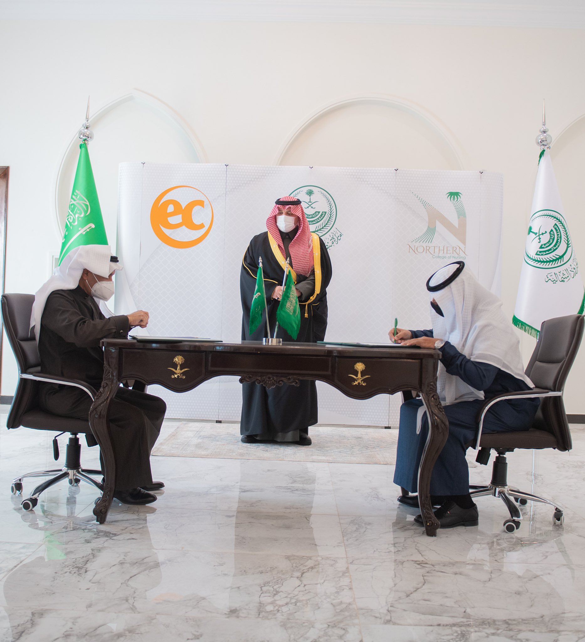 شهد صاحب السمو الملكي الأمير فيصل بن خالد بن سلطان بن عبدالعزيز، أمير منطقة الحدود الشمالية بمقر الإمارة اليوم, توقيع اتفاقية تعاون بين كلية الشمال للتمريض ويمثلها رئيس مجلس الإدارة شافي بن فاحس الصقري، ومعاهد EC العالمية للغة الإنجليزية ويمثلها رئيس مجلس الإدارة محمد بن أحمد الغامدي.
