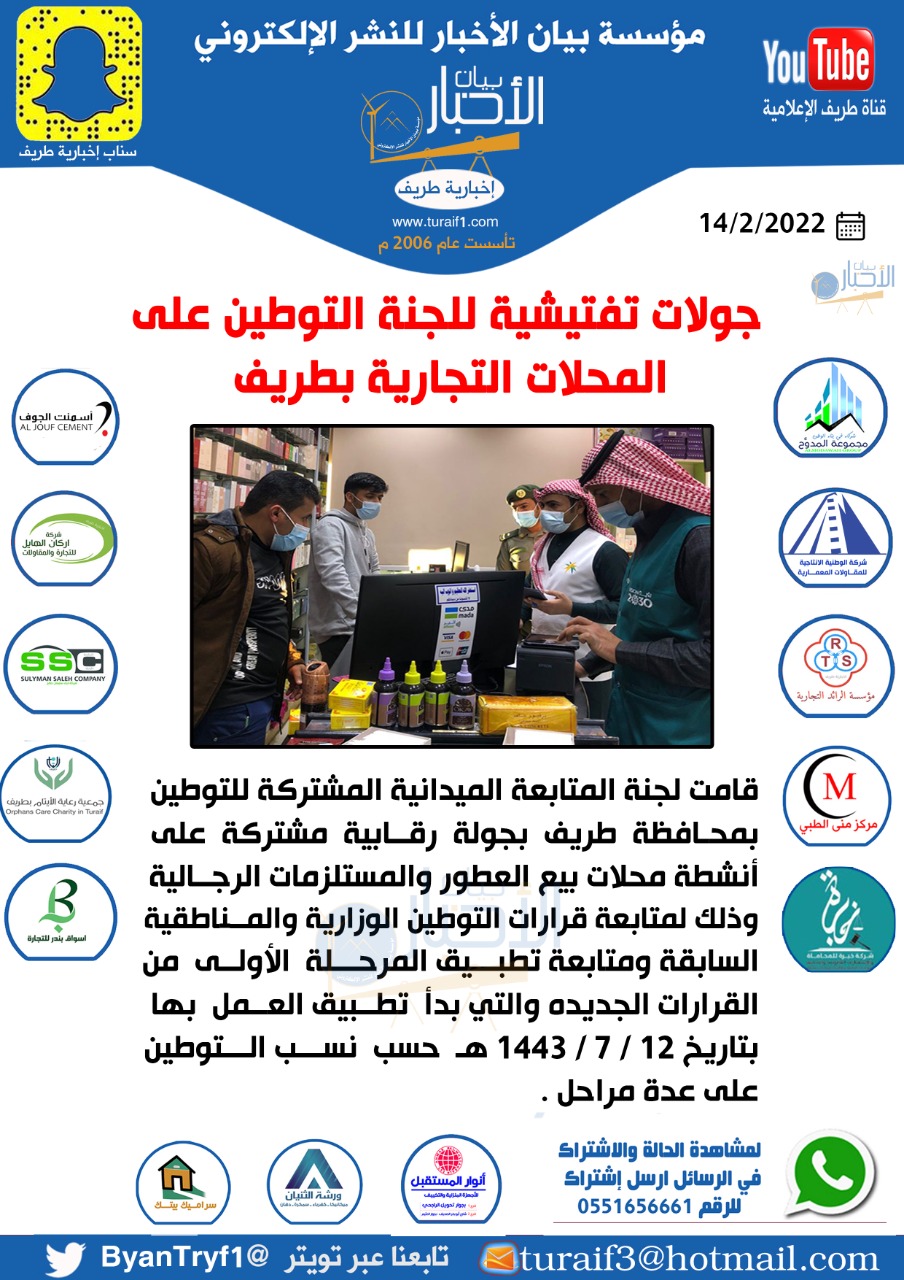 قامت لجنة المتابعة الميدانية المشتركة للتوطين بمحافظة طريف بجولة رقابية مشتركة على أنشطة محلات بيع العطور والمستلزمات الرجالية وذلك لمتابعة قرارات التوطين الوزارية