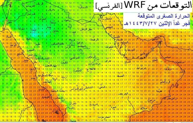 وأضاف “الحصيني” أن “درجات الحرارة الصغرى المتوقعة على المنطقة الشمالية تتراوح من 2 درجة مئوية إلى 8 درجات مئوية، وعلى المنطقة الوسطى والمرتفعات وشرق المرتفعات من 9 درجات مئوية إلى 17 درجة مئوية، وعلى المدينة المنورة والمنطقة الشرقية من 10 درجات مئوية إلى 18 درجة مئوية، وعلى الساحل الغربي من 12 درجة مئوية إلى 25 درجة مئوية؛ إلا أن يصرفها الله”.