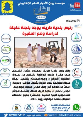 وقف رئيس بلدية طريف المهندس عثمان الضبعان على مقبرة طريف الواقعة بالقرب من سوق الماشية ( الحراج ) ، ووجه سعادته بتشكيل لجنة عاجلة لمعالجة سوء التربة بشكل مؤقت وسرعة البحث عن موقع آخر وفق معاير علمية جولوجية .