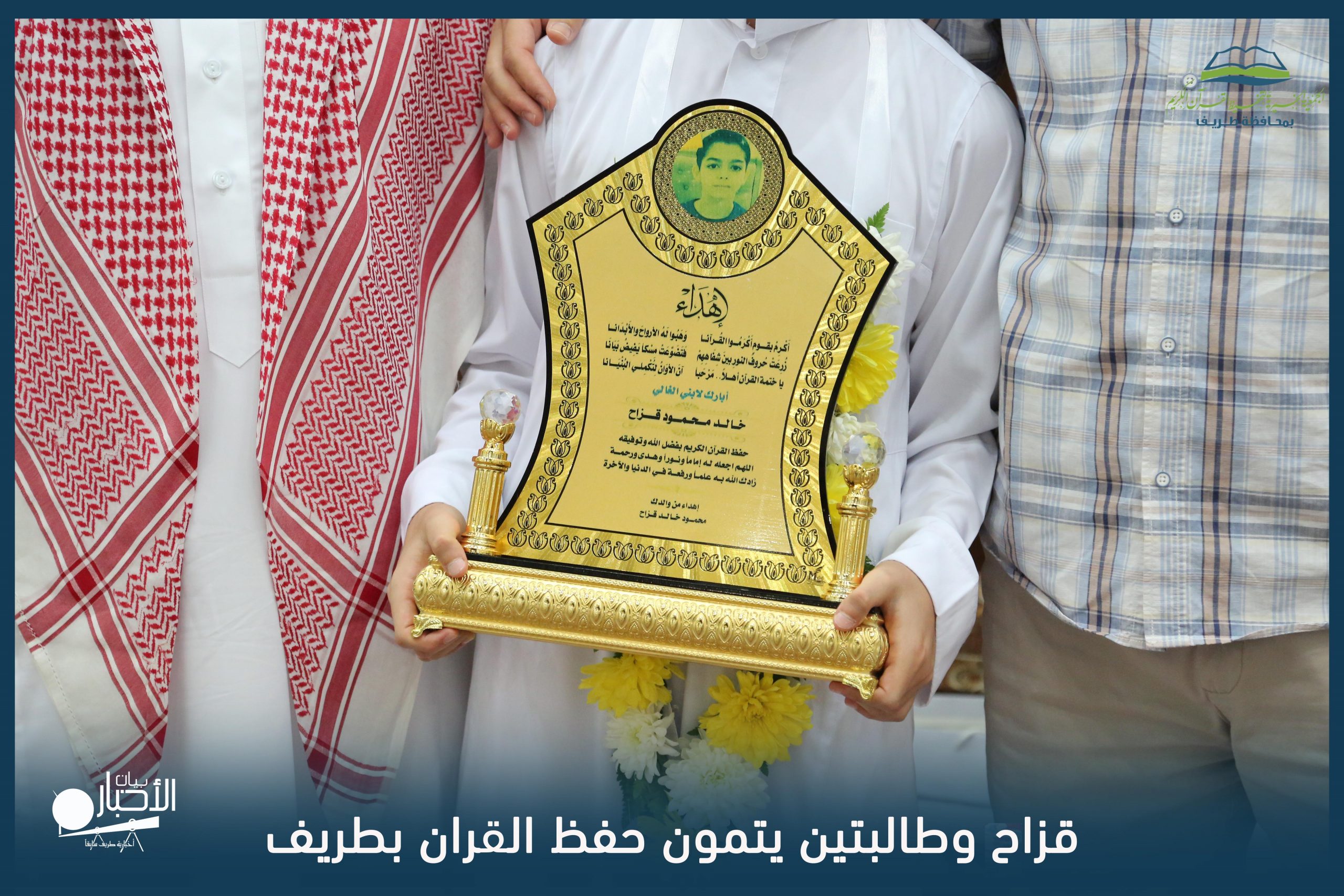 أقامت جمعية تحفيظ القرآن بطريف حفل للطالب خالد محمود قزاح من مدرسة جامع محمد بن عبدالوهاب القرآنية بمناسبة إتمامه لحفظ القرآن الكريم كاملا ، وتشرّف الحفل برعاية الأستاذ ثاني مسهوج العنزي رئيس مجلس إدارة جمعية رعاية الأيتام والأستاذ محمد سالم الرويلي نائب الرئيس قدموا فيها جوائز عينية ومالية ودعوة لضيافة الطالب ووالده في مقر الجمعية
