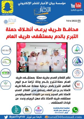 نظم القطاع الصحي بطريف ممثلا بمستشفى طريف العام حملة للتبرع بالدم وذلك تزامناً مع اليوم العالمي للتبرع بالدم ، برعاية سعادة محافظ طريف الأستاذ بدر بن نجر الصقر ، وبحضور مدير القطاع الصحي الأستاذ ناصر المدوح وعدد من القيادات العسكريةومدير مستشفى طريف الاستاذ خالد مهل الرويلي وعدد من قيادات المستشفى .