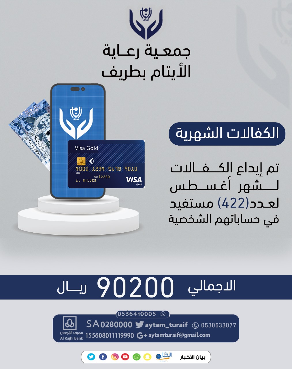 قامت جمعية رعاية الأيتام بمحافظة طريف بإيداع الكفالات الشهرية لشهر أغسطس بحسابات مستحقيها.