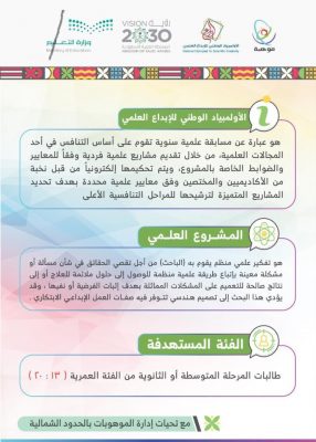 ومن جهة أخرى دعت إدارة الموهوبات بـتعليم الحدود الشمالية طالبات المرحلة المتوسطة و الثانوية للتسجيل بالأولمبياد الوطني للموهبة و الإبداع “إبداع”.