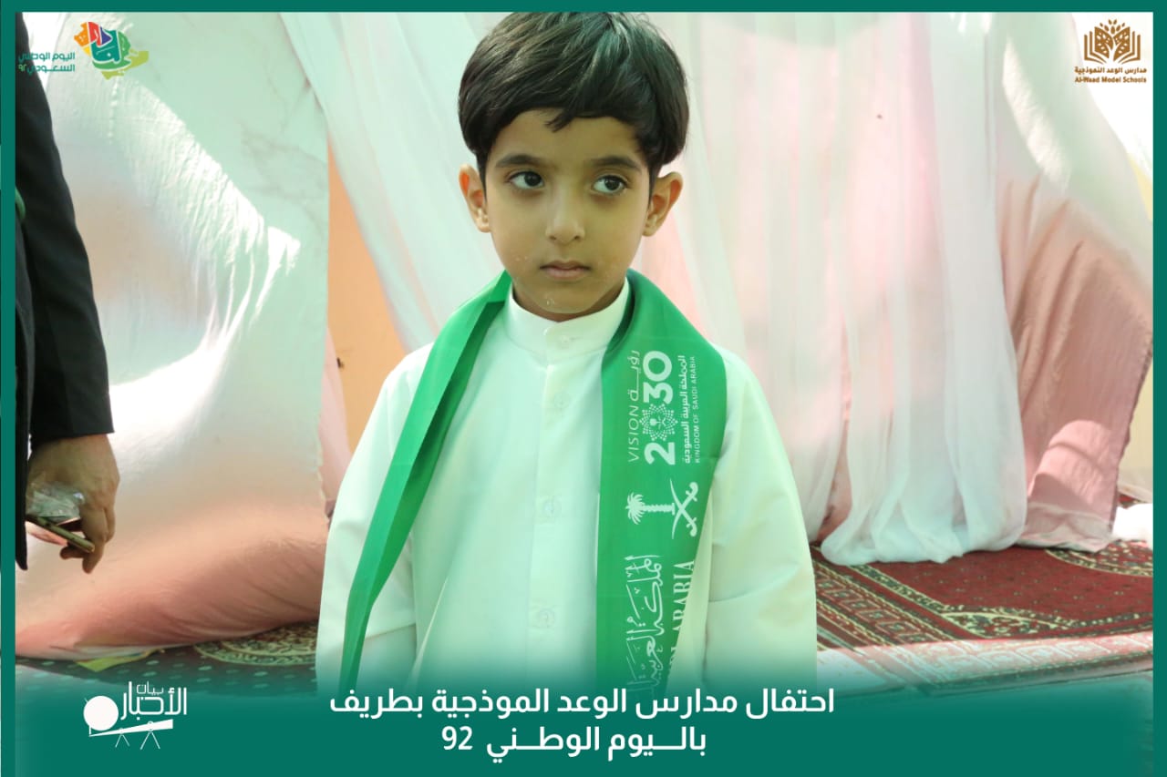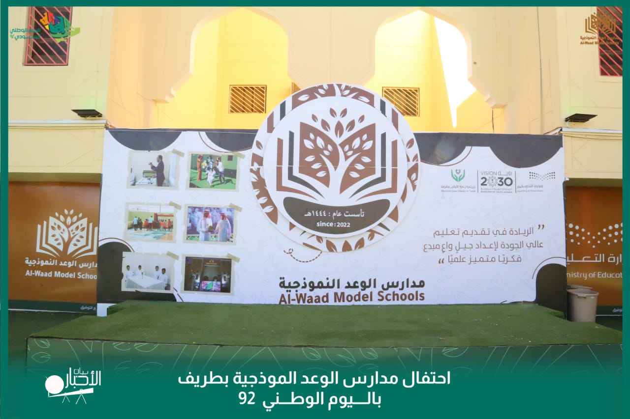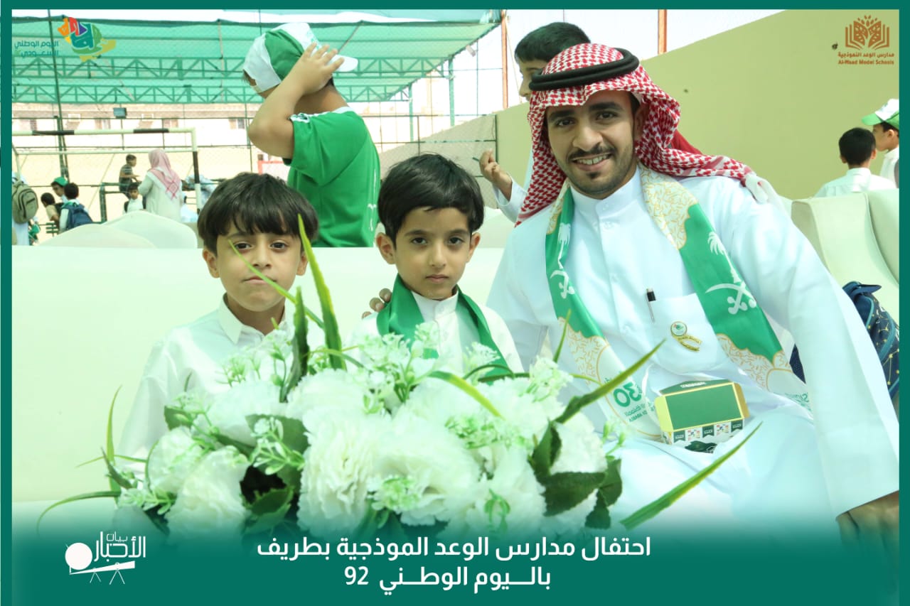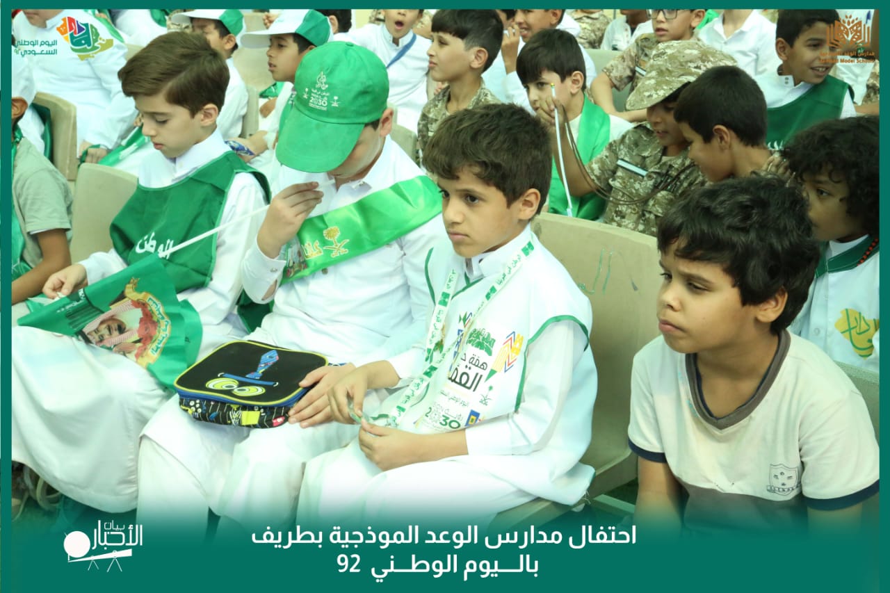 أحتفلت مدارس الوعد النموذجية باليوم الوطني بحضور مدير مكتب التعليم ( المكلف ) الأستاذ حامد هلال الحازمي ورئيس مجلس إدارة جمعية رعاية الأيتام الأستاذ ثاني مسهوج العنزي وعدد من أعضاء مجلس إدارة الجمعية بالإضافة إلى شخصيات تربوية .