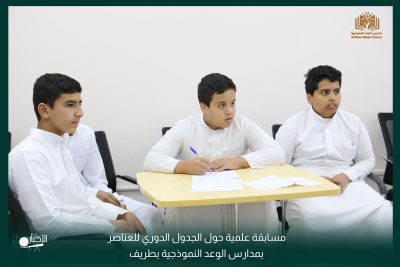 أقامت مدارس الوعد النموذجية بمحافظة طريف مسابقة علمية حول الجدول الدوري للعناصر الكيميائية وذلك يوم الاثنين 10 أكتوبر وذلك في إطار رعاية وصقل المواهب العلمية للطلاب الموهوبين.