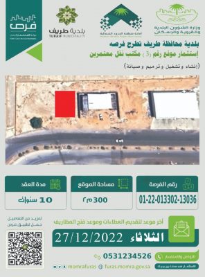 أعلنت بلدية محافظة طريف عن طرح عدة فرص استثمارية وهي كالتالي: