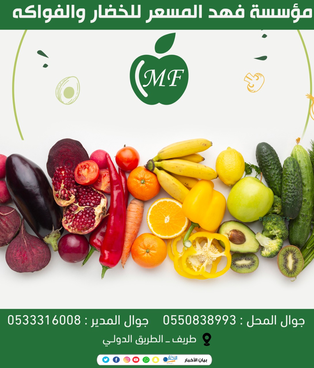 افتتح رجل الأعمال فهد المسعر محل للخضار والفواكه بمحافظة طريف بأسعار في متناول الجميع وتشكيلة متنوعة تشمل جميع الخضراوات والفواكه كما ويعلن عن توافر الخضروات يوميا وطازجه وبأسعار وجودة لا مثيل لها على الطريق الدولي بجانب سمسا